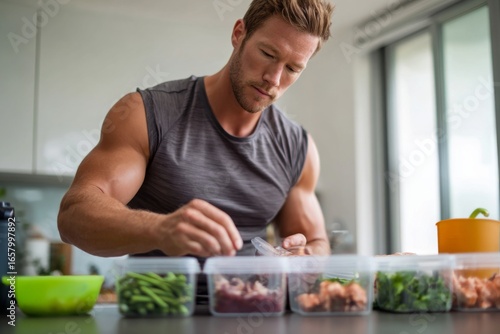 In a modern kitchen, a muscular man organizes containers filled with vegetables and proteins for his meal prep routine. He focuses on healthy eating habits and nutrition
