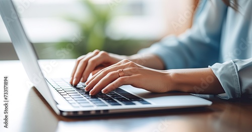 In a office setting, a desk is adorned with a laptop, and hands are actively typing away. Whether engaged in remote work, conducting internet searches, or managing a blog, close-up scene.