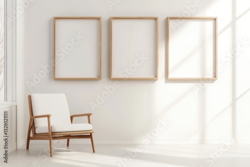 In a pristine, light-filled room, three empty wooden frames stand vertically on the wall, promising endless possibilities for artwork or cherished memories A simple, modern chair sits nearby