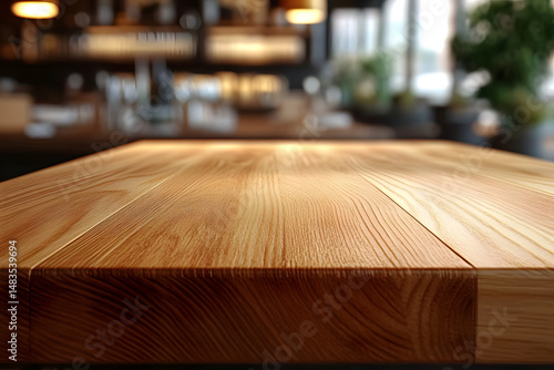 In a restaurant, a brown wood table with a blurred background provides an empty space for product display or montage on a wooden board