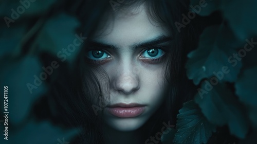 In a secluded area surrounded by dense foliage, a young woman with striking blue eyes gazes directly forward, revealing a sense of mystery and depth in her expression
