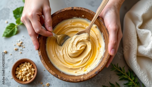 In a serene kitchen setting, a pair of female hands delicately blends a natural facial mask within a rustic wooden bowl The creamy mixture, illuminated by soft light, promises rejuvenation and a