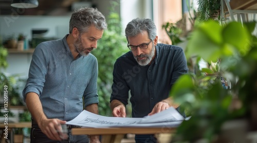 sleek, modern, office, 2, figure, contractor, architect, engaged, lively, discussion, their, brow, furrowed, concentration, blueprint, home, selecting, sustainable, material, create, harmonious, blend, functionality, environmental