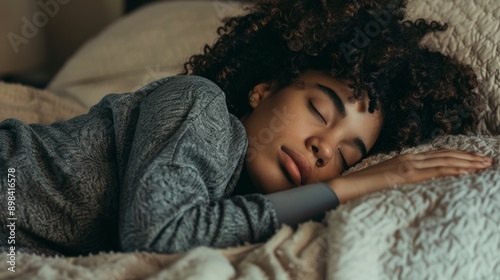 In bed with weariness and burnout, a woman dreams and relaxes to relieve stress. Person and girl in house or home lying on cushion in apartment for wellbeing and serenity