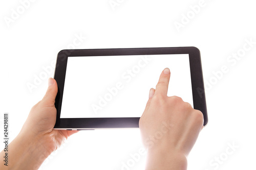 tablet, isolated, white, computer, holding, screen, hand, background, touch, hand, woman, people, business, female, hold, pad, technology, blank, contraption, laptop, mobile, digital, communication, cyberspace, device, display, monitor, wireless, electronic, advertise, portable, touchpad, media, equipment, banner, social, message, information, page, network