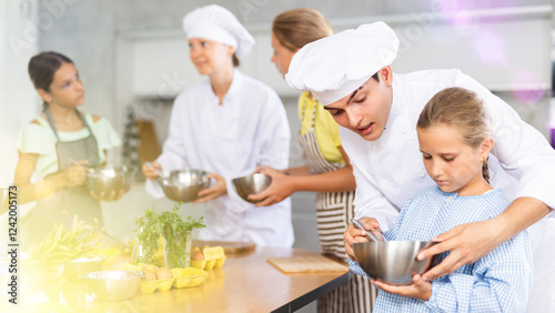 In restaurant kitchen during children cooking class, male chef help small girl thoroughly stir homogeneous liquid dough with whisk. In background, blurry participants are standing near table with food