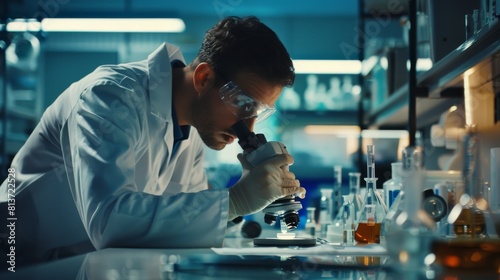 In the background, a large pharmaceutical laboratory has experts conducting medicine and biotechnology research. Male scientist using microscope analyzes petri dish sample.