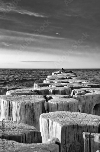 In the Baltic Sea groynes rise into the horizon in black and white. Breakwater