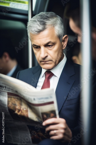 In the bustling subway, a 45-year-old gray-haired man, successful in business, immerses himself in his morning newspaper, a moment of calm during his daily commute. Generative AI