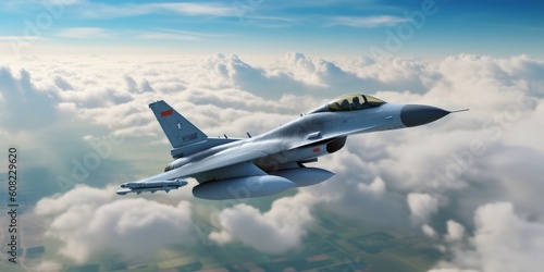 In the clouds. View of combat plane that is flying. Beautiful illustration picture. Generative AI