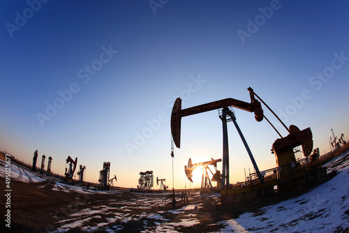 In the evening, oil pumps are running, Silhouette of beam pumping unit