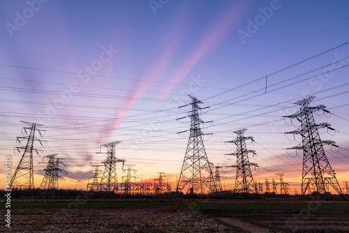 In the evening, the silhouette of high voltage towers