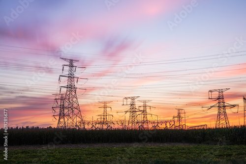 power, electric, industry, pylon, wire, silhouette, electricity, danger, industrial, evening, environment, voltage, structure, engineering, technology, transmission, energy, tower, high, supply, electrical, metal, cable, line, equipment, distribution, powerful, sky, blue, station, volt, generator, plant, cloudy, sunset, network, substation, infrastructure, photovoltaic, sun, transformer, facility, unit, dusk, resource, sundown