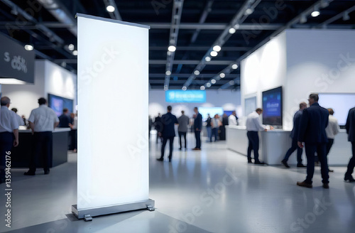 In the foreground is roll up banner blank mock up against the backdrop of a blurry technology exhibition.