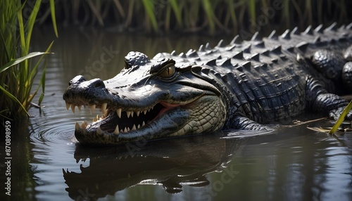 In the murky waters a formidable crocodile lurks and its sinister gaze fixed on its surroundings with sharp focus