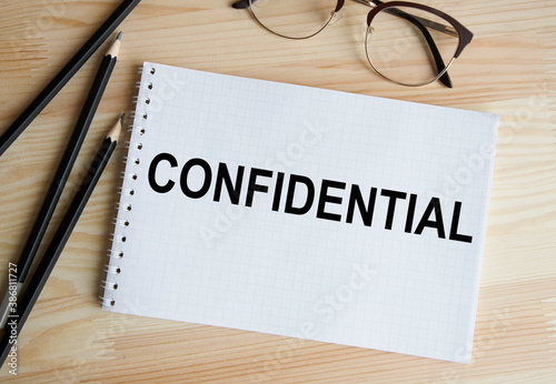 In the notebook the text CONFIDENTIAL, next to pencils, glasses.