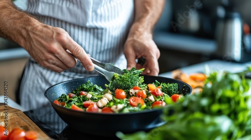 In this dynamic kitchen scene, a chef skillfully prepares a colorful salad with a mix of fresh vegetables, showcasing culinary expertise and attention to nutritional details.
