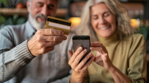 In todays digital era, a senior couple uses a credit card for online shopping, adopting modern technology for convenient digital transactions, portraying a contemporary lifestyle