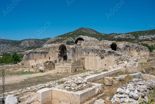 caravanserai, scenic, muslim, tour tourism, historical, building, panorama, destination, mediterranean, landscape, wall, travel, region, gate, arch, turkish, turkey, culture, blue, hill, stone, ancient, history, heritage, mediaeval, old, historic, eastern, art, sky, architecture, day, portal, landmark, entrance
