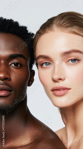 Inclusive beauty campaign with men and women using identical skincare products, minimalistic styling, clean background, promoting gender-neutral trends in modern cosmetics.