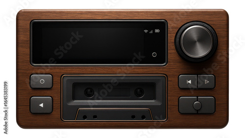 In-dash multimedia center with a vintage woodgrain finish and cassette player