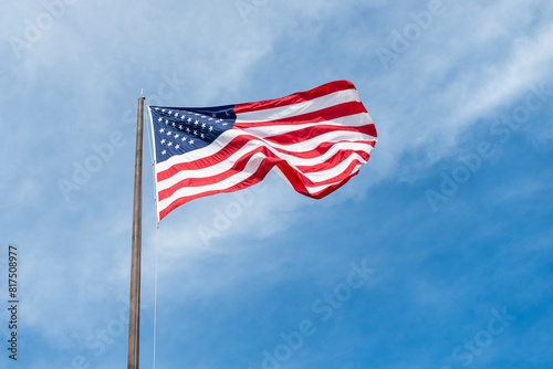 Independence day. Patriotic symbol. American Flag for Memorial Day or 4th of July. American flag waving in the wind. Flag of the USA. National waving flag of united states on blue sky. Labor day