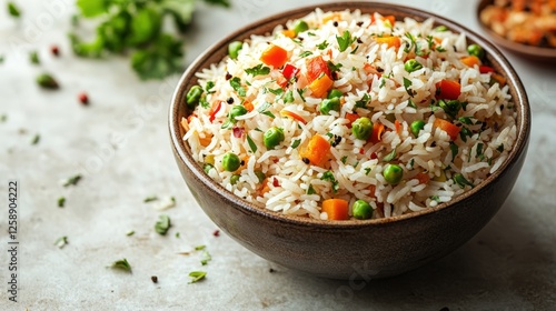 Indian biryani rice bowl with saffron and mixed vegetables on a white background