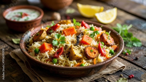 Indian cuisine. Vegetable Biryani is a fragrant dish of Indian cuisine made from basmati rice, vegetables and a rich set of spices.