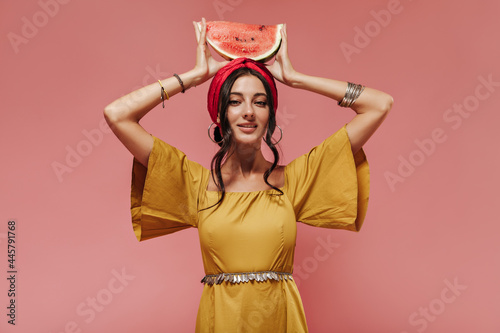 Indian girl with black wavy hair in headband and yellow fashionable clothes holding watermelon on her head on pink backdrop..