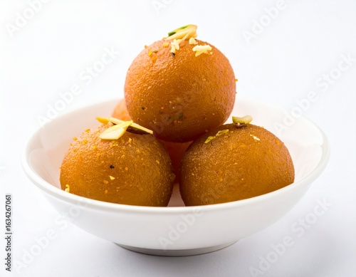 Indian gulab jamun with saffron syrup and pistachio on white background