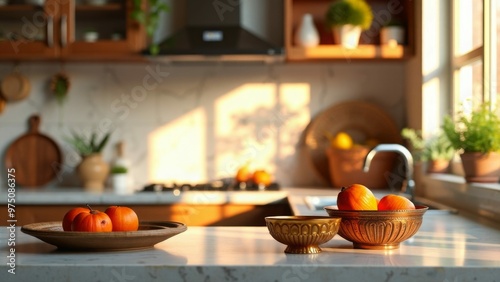 indian modern clean festive diwali kitchen, morning shot, sunlight, decorative kitchen in background with kitchen platform in front