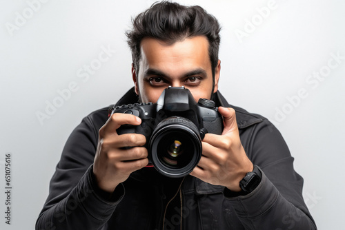 Indian Photographer With Camera on white background.