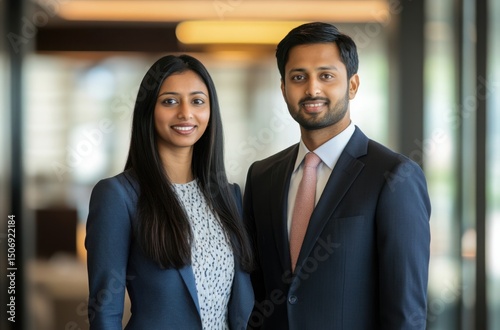 Indian professional pair, confident body language, elegant formal clothing, portrait from shoulders up