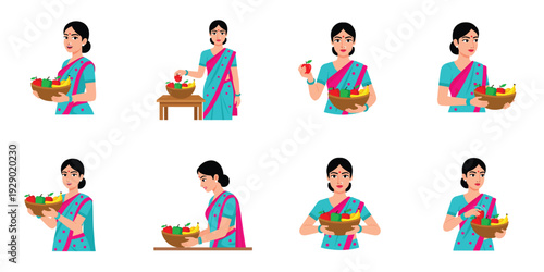 woman, indian, fruit, bowl, holding, posing, set, people, culture, traditional, colourful, flat, isolated, cut-out, transparent, background, food, healthy, eating, presentation, branding, portrait, female, ethnic, lifestyle, cooking, gathering, harvest, produce, basket, still life, meal, nourishment, fresh, organic, market, grocery, table, home