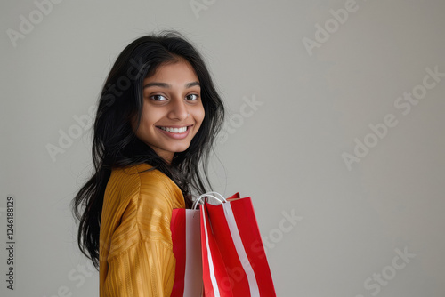 indian, asian, woman, female, smiling, happy, expression, attractive, cheerful, celebration, festival, shopping, smile, buy, shopper, present, fashionable, excitement, lifestyle, enjoyment, traditional, person, clothing, looking, style, bag, concept, commerce, gesture, happiness, business, purchase, positive, lifestyle, standing, showing, fashion, posing, sale, people, paper bag, holding, purchasing, ai