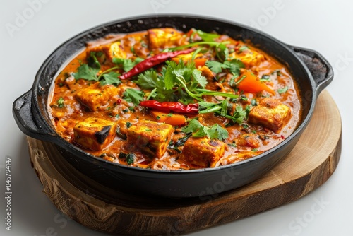 Indian-style cottage cheese vegetarian curry dish. Kadai Paneer - traditional Indian food. paneer tikka masala in a pan on a wooden board on a white background
