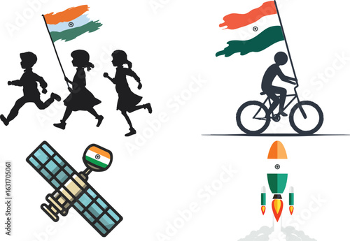 india, indian, flag, progress, independence, day, space, satellite, rocket, children, running, set, proud, holding, people, cycling, bicycle, growth, development, patriotism, future, technology, innovation, science, nation, celebration, commonwealth, graphic, vector, illustration, icon, kit, collection, isolated, journey
