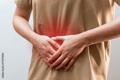 Indigestion, stomachache concept. Digestive system problems, stomach ache, pain, inflammation. Hand holding hurting painful abdomen belly