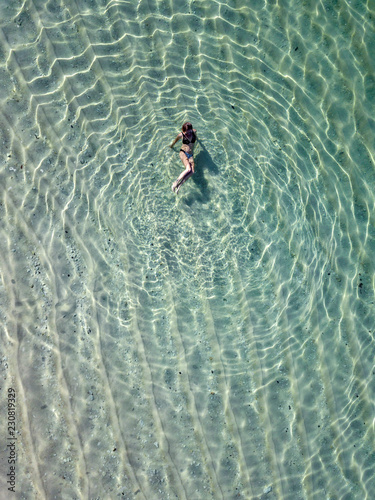 Indonesia, Bali, Melasti, Aerial view of Karma Kandara beach, woman in water