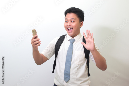 Indonesian senior high school student wearing white shirt uniform with gray tie waving his hand to mobile phone, saying hi while doing video call. Isolated image on white background