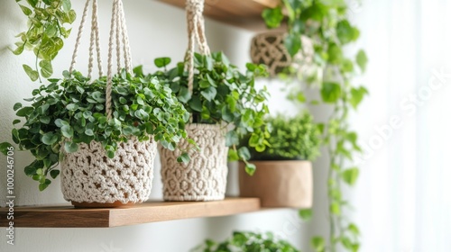houseplant, greenery, green leaf, home decor, interior design, macrame, shelf, home interior, fresh air, living space, potted plants, healthy living, white background, environmentally friendly