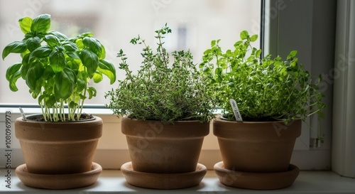 indoor, herb, garden, window sill, basil, thyme, oregano, plant, pottery, terracotta, pot, green, leaf, homegrown, window, light, natural, fresh, culinary, kitchen, gardening, agriculture, organic, healthy, cooking, vegetation, flora, sunlight, domestic, leafy, aromatic, edible, growth, horticulture, nourishment, food, preparation, environmentally friendly, windowpane, sill, nature, nurture