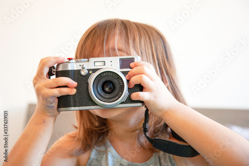 Indoor lifestyle portrait of cute little girl making photo. Talented little girl has fun with vintage camera. Trendy little girl making photo at home. Leisure activity at home. Young female talent.