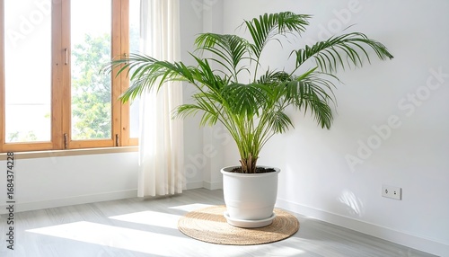 indoor plant, corner, bright, home decor, houseplant, plant, green, whitewall, window, natural light, interior, room, minimalist, domestic, flora, botany, botanical, leaf, leaf, container, pot, home, living room, apartment, indoor, decoration, style, design, furniture, calming, peaceful, lifestyle, trendy, modern, fresh, clean, tropical, palm, floor, mat, light