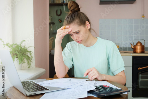 female, difficult, situation, money, home, finance, bill, caucasian, financial, girl, people, young, account, adult, business, casual attire, table, tax, work, debt, budget, student, life, paper, indoor, house, lifestyle, kitchen, bored, bewildered, emotion, sleepy, exhausted, enough, pensive, youth, 20s, t-shirt, sad, help, wants, datum, canvasses, serious, importance, roomy, document, calculating machine, laptop