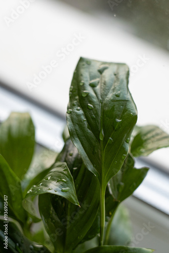 Indoor plant with droplets of water clinging to its vibrant leaves, captured in natural light by a window on a rainy day