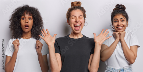 Indoor shot of European woman with hair bun dressed in black t shirt African female model clenches fists cheerful Iranian female isolated over white background. Three women express positive emotions
