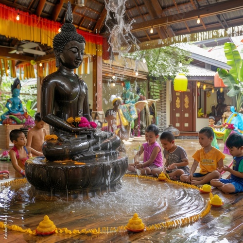 indoor, songkran, setup, buddha, statue, children, playfully, participate, water, pour, respect, family, memory, integrity, connection, cherish, bridge, laughter, joyous, custom, special, blessing, puckered, year, heritage, value, memorable, art, modernity, diversity