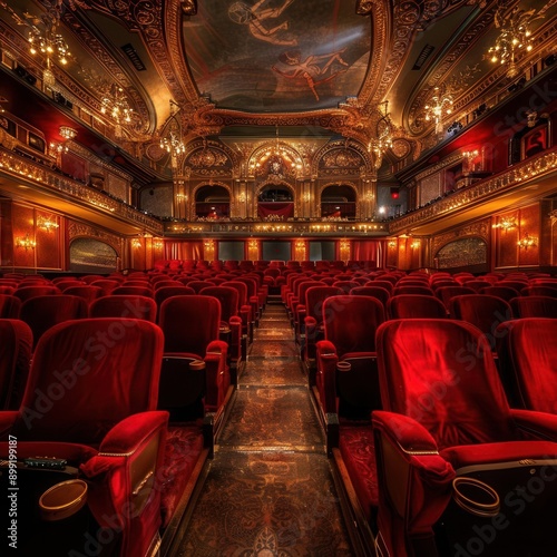 indoor, theatre, auditorium, plush, red, seat, dim, light, ornate, detail, glamourous, fanciful, trendy, expansive, theatre, opulent, indulgent, stylish, atmosphere, regal, posh, design, stunning, pamper, lavish, refine, aesthetic, cosy, artistic, exclusive, ornament, performance, acoustic, enhance, luxurious, impose, elegant, perspective, opulent