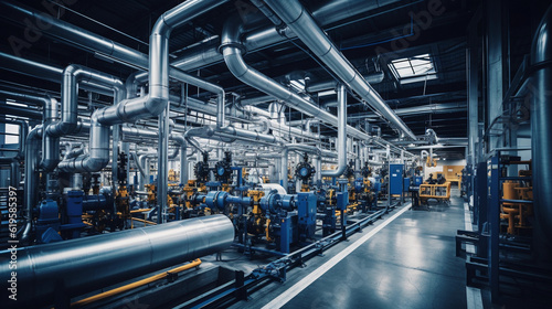 Industrial area. Steel pipelines valves and pumps in huge factory building